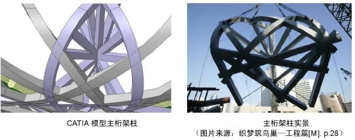 CATIA V5 R13 作為理想的新工具被引入“鳥巢”的設(shè)計之中,在此之前,國內(nèi)尚無在建筑行業(yè)采用CATIA的先例?!傍B巢” CATIA建模工作,由建筑師與結(jié)構(gòu)工程師經(jīng)過艱苦而高效的工作在高配置電腦中共同完成。CATIA軟件在我國建筑工程中的首次應(yīng)用,便成功地解決了復(fù)雜空間、結(jié)構(gòu)、彎扭構(gòu)件與特殊節(jié)點建模問題,為“鳥巢”建立了關(guān)鍵性的高精度三維設(shè)計平臺,從而為“鳥巢”從描畫在紙上的想象和理念走向矗立在大地的真實建筑的出生之路創(chuàng)造了基本條件和前提。