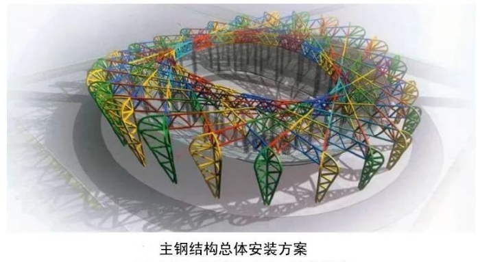 “鳥巢”的鋼結(jié)構(gòu)被稱作巨型大跨度鋼桁架交叉旋轉(zhuǎn)編織式結(jié)構(gòu)。鋼結(jié)構(gòu)頂面呈鞍形,長軸為332.3m,短軸為296.4m,最高點高度為距地68.5m,最低點距地高度為40.1m,屋蓋中部的洞口結(jié)構(gòu)長度為185.3m,寬度為127.5m。大跨度屋蓋支撐在24根桁架柱之上,柱距為37.958m。大跨度屋蓋結(jié)構(gòu)采用交叉平面桁架體系,主桁架圍繞屋蓋洞口環(huán)梁放射形布置,有22榀主桁架直通或接近直通,為了避免出現(xiàn)過于復(fù)雜的節(jié)點,4榀主桁架在環(huán)梁處截斷。由于主桁架與內(nèi)環(huán)相切,其中一些主桁架在平面外微彎,24根桁架柱與主桁架+立面次結(jié)構(gòu)共同形成抗側(cè)力體系。