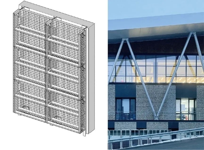 建筑外墻采用鋁板及門窗,結(jié)合貼實(shí)木皮的樹脂板、重新設(shè)計(jì)的建筑裝飾石籠墻以及耐磨混凝土地面和清水混凝土,構(gòu)成了建筑獨(dú)特的造型和外觀,形成國家雪車雪橇中心標(biāo)志。附屬建筑與遮陽棚V形鋼柱、裝飾石籠墻、木瓦和清水混凝土等相互呼應(yīng),將整個(gè)雪車雪橇中心的賽道與場館整合在一起。其中裝飾石籠墻的石頭采取就地取材,即將場地挖出的石頭破碎而成。