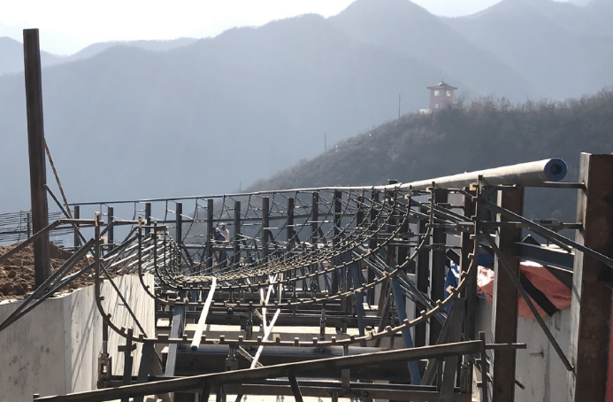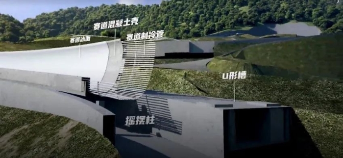 國家雪車雪橇中心采用世界頂尖的賽道設(shè)計(jì),賽道底部是一個(gè)U形槽,U形槽內(nèi)布置鋼筋混凝土搖擺柱支撐賽道。賽道設(shè)計(jì)成復(fù)雜的空間三維曲面,其找形與內(nèi)部設(shè)置的卡具息息相關(guān),建設(shè)彎道時(shí),會(huì)按照賽道的形狀布置相應(yīng)的卡具,在卡具上鋪設(shè)制冷管(卡具和制冷管道是賽道的骨架和血液),然后再鋪設(shè)經(jīng)過特殊處理的鋼筋網(wǎng)片,最后設(shè)置找平管。并采用噴射混凝土成型。在賽道外側(cè)設(shè)置保溫層,冬季比賽和訓(xùn)練時(shí)賽道內(nèi)側(cè)澆筑50mm厚的冰面。