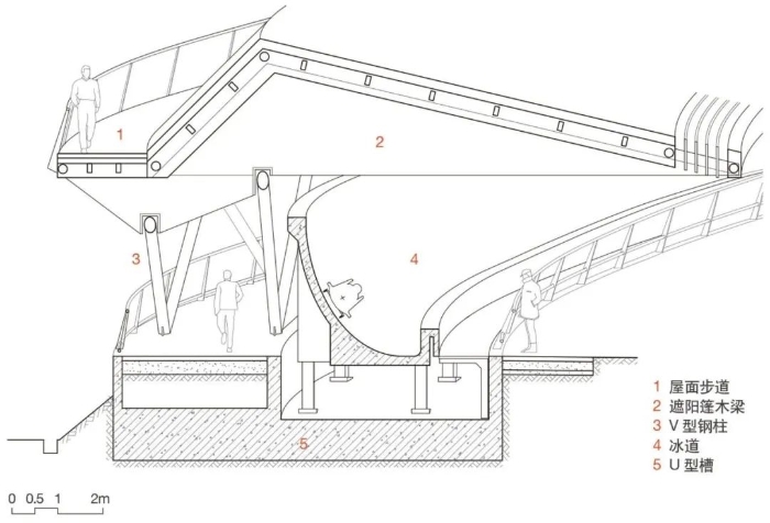 與其他國家賽道不同,國家雪車雪橇中心增加了一個(gè)賽道遮陽屋頂,其遮陽棚主體結(jié)構(gòu)采用了全球首創(chuàng)的鋼木組合單邊懸挑結(jié)構(gòu)體系,單邊最大懸挑長度12.65m。鋼筋混凝土U形槽、V形鋼柱、木梁、木瓦屋面共同組成了為冰道遮光擋雨的遮陽棚系統(tǒng)。