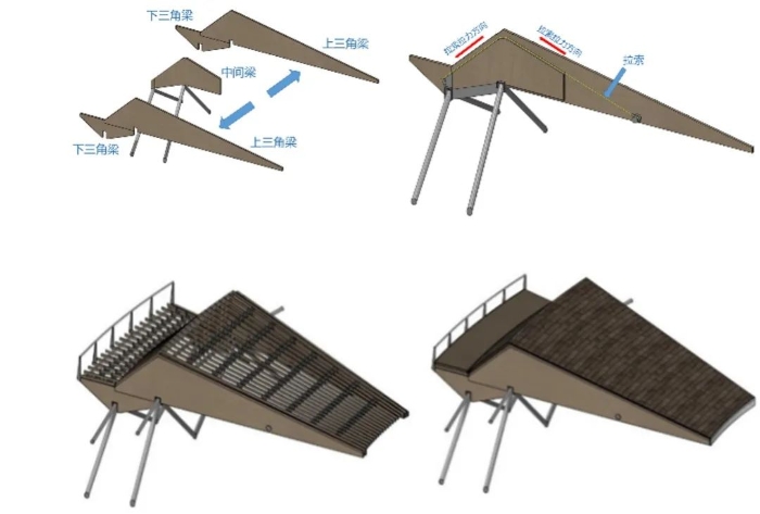 遮陽棚木梁采用了三明治結(jié)構(gòu),外層為兩片膠合木梁,中間層為鋼木組合結(jié)構(gòu),由拉索將懸挑端的拉力經(jīng)屋脊傳遞至V形鋼柱,高效地解決了單邊長懸挑的力學(xué)要求。