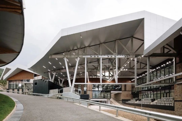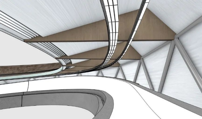 國家雪車雪橇中心以賽道為核心,遮陽棚覆蓋于賽道上。根據(jù)體育功能的需求,沿著賽道的標(biāo)高布置出發(fā)區(qū)、結(jié)束區(qū)、制冷機(jī)房以及訓(xùn)練道冰屋、運(yùn)營區(qū)等附屬建筑,與媒體轉(zhuǎn)播區(qū)、觀眾主廣場等場地構(gòu)成了完整的雪車雪橇場館。