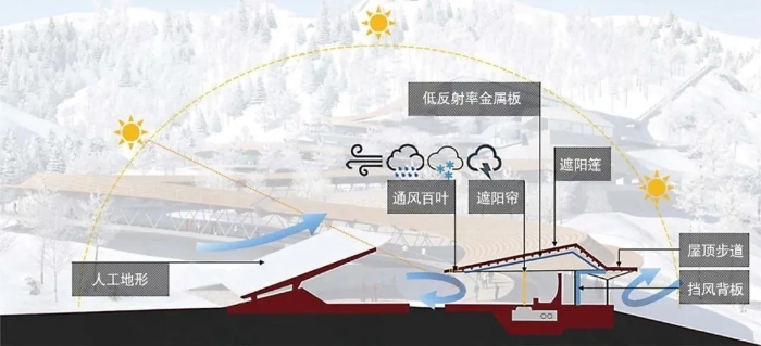 國家雪車雪橇中心場館選址S2地塊位于山體的南坡而非大多數(shù)場館的北坡,相比北坡,南坡賽道的氣候條件更為嚴(yán)苛。對(duì)于賽道而言,太陽輻射特別是直射輻射會(huì)導(dǎo)致部分冰面軟硬不一,直接影響賽道的安全性和運(yùn)動(dòng)員的競技水平,制冷能耗也會(huì)隨之攀升。李興鋼設(shè)計(jì)研究團(tuán)隊(duì)提出了讓雪車雪橇場館“南坡變北坡”的設(shè)計(jì)策略,使處于南坡的雪車雪橇中心節(jié)能效率不低于北坡。結(jié)合賽道形狀、自然地形和人工地形、遮陽屋頂、遮陽設(shè)施(遮陽簾及擋風(fēng)背板)等,研發(fā)出“地形氣候保護(hù)系統(tǒng)”(Terrain Weather Protection System,簡稱“TWPS”),有效保護(hù)賽道冰面,降低氣候因素對(duì)賽道的影響,確保賽事高質(zhì)量進(jìn)行,并最大限度降低能源消耗。
