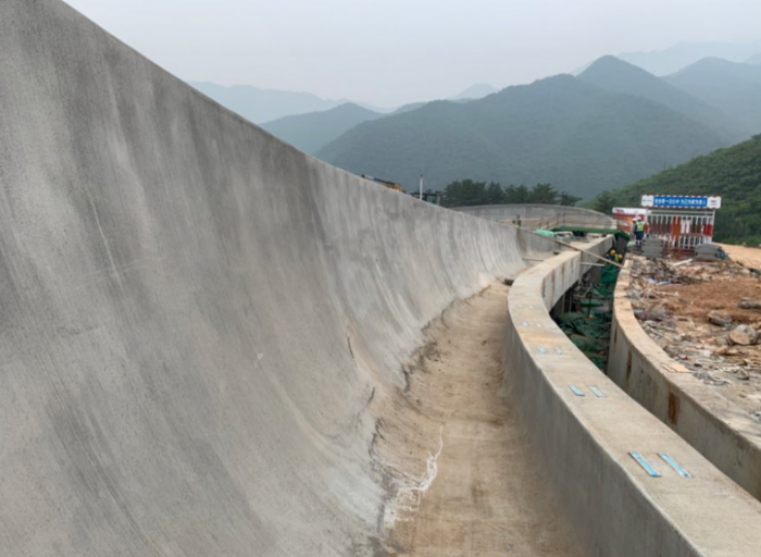 國家雪車雪橇中心的賽道長1975m,高差超100m,由16個(gè)角度、傾斜度各異的彎道組成。通過防震縫分為47段,僅有10段是直線段,其余都是曲線段,最長賽道段長度達(dá)70m。賽道為空間扭曲雙曲面殼體結(jié)構(gòu),賽道結(jié)構(gòu)表面平整誤差要控制在1毫米以內(nèi),且結(jié)構(gòu)中則預(yù)埋了近11萬米的制冷管線,用于通冷制冰。為確保賽道高速比賽的安全性,賽道不同滑面內(nèi)部均要達(dá)到相同的密實(shí)度和表面空間成型精度。
