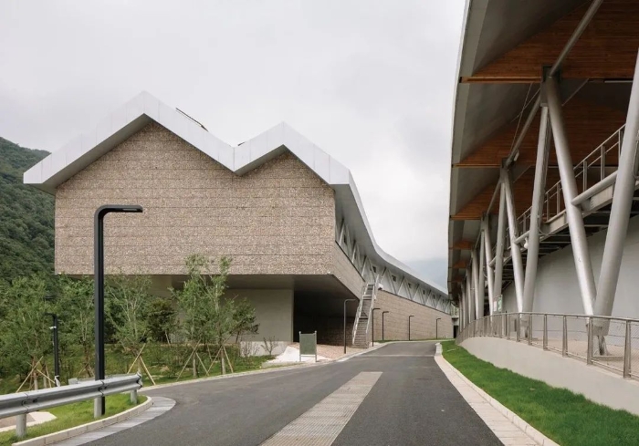 國家雪車雪橇中心以賽道為核心,通過相同的坡屋面將分散布置的出發(fā)區(qū)、結(jié)束區(qū)、制冷機(jī)房、訓(xùn)練道冰屋、運(yùn)營和后勤綜合區(qū)各建筑串聯(lián)在一起。