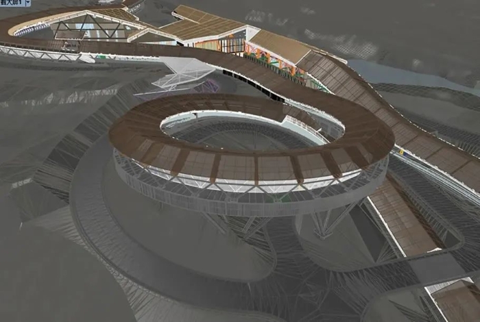 建筑BIM設(shè)計(jì)與場地BIM同時(shí)開展,并和場地BIM設(shè)計(jì)一同形成了兩條主線:建筑BIM設(shè)計(jì)以雪車雪橇賽道及附屬建筑為主線開展建筑模型的搭建;場地BIM設(shè)計(jì)以場地豎向設(shè)計(jì)、賽道U型槽、車行道、伴隨路及場地巖土構(gòu)件為主線開展場地模型的搭建。兩條獨(dú)立的線索在后續(xù)場館整體BIM設(shè)計(jì)中,通過各自不同的方式開展設(shè)計(jì)和建模,但兩條主線始終互相共享數(shù)據(jù)、互相校核并且最終實(shí)現(xiàn)了模型的整體融合。