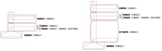 回復(fù):地基基礎(chǔ)設(shè)計應(yīng)按設(shè)防地震作用進行設(shè)計。其中,地基部分應(yīng)按照設(shè)防地震作用進行地基承載力驗算;基礎(chǔ)部分應(yīng)按普通豎向構(gòu)件和重要水平構(gòu)件(《隔標》4.4.6條第2款)的要求進行設(shè)計,當基礎(chǔ)構(gòu)件(如筏板、基礎(chǔ)梁等)與下支墩直接相連時,尚應(yīng)按照《隔標》4.7.2條進行大震包絡(luò)設(shè)計。地基基礎(chǔ)部分設(shè)計示意圖如下: