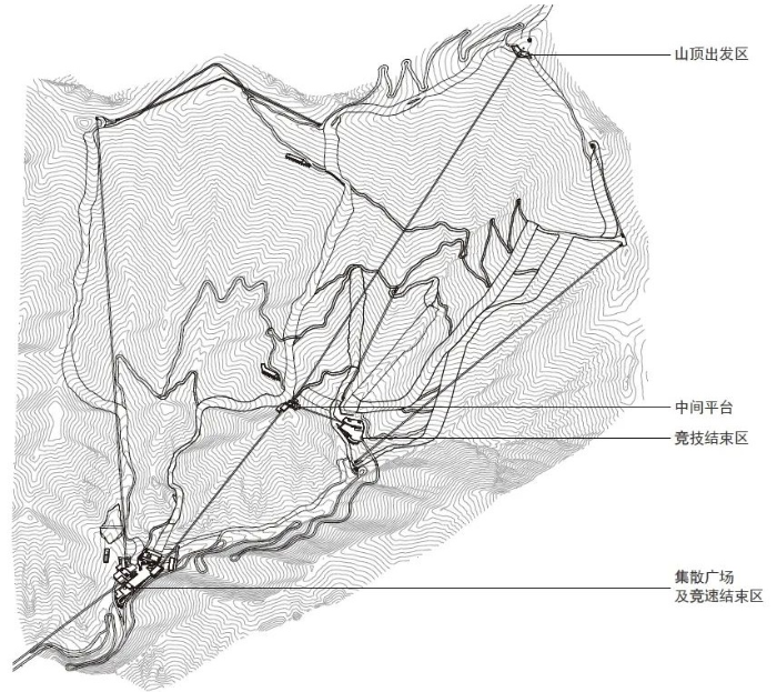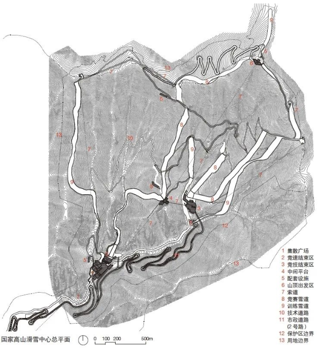 國家高山滑雪中心是國內(nèi)第一座按冬奧賽事標(biāo)準(zhǔn)建設(shè)的高山滑雪場館,將進行北京冬奧會和冬殘奧會高山滑雪所有項目的比賽,共設(shè)有3條競賽雪道、4條訓(xùn)練雪道以及其他聯(lián)系雪道和技術(shù)雪道,各類雪道總長度約為23.1km,最大垂直落差約925m,最大坡度達68度。賽區(qū)內(nèi)設(shè)置競速與競技兩個結(jié)束區(qū),容納核心功能的永久建筑及臨時設(shè)施分散布局,圍繞雪道規(guī)劃形成集散廣場及競速結(jié)束區(qū)、競技結(jié)束區(qū)、山頂出發(fā)區(qū)等主要建設(shè)區(qū)域。