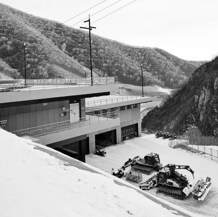 國家高山滑雪中心采用相對設(shè)施化的建筑語言反映了“低調(diào)而消隱”(Low-pitched and Hidden)的設(shè)計態(tài)度。對材料品類的篩選提煉也是對山地建筑完成度的控制策略;考慮山地運輸及安裝條件,預(yù)先做了小尺度的板塊劃分,板材多采用開縫處理,減少施工工序;山地環(huán)境類別和嚴寒氣候分區(qū)要求設(shè)計對材料耐候性、耐久性、抗凍性、吸水率等相關(guān)技術(shù)參數(shù)嚴格控制;扶梯、電梯相應(yīng)采取桁架內(nèi)及井道內(nèi)設(shè)置加熱設(shè)備來應(yīng)對高山環(huán)境可能出現(xiàn)的極寒天氣;對停車及壓雪車過車平臺混凝土面層材料的抗鹽凍性要求進行了專家論證,采用F50抗凍混凝土配筋面層切實可行的解決方案。