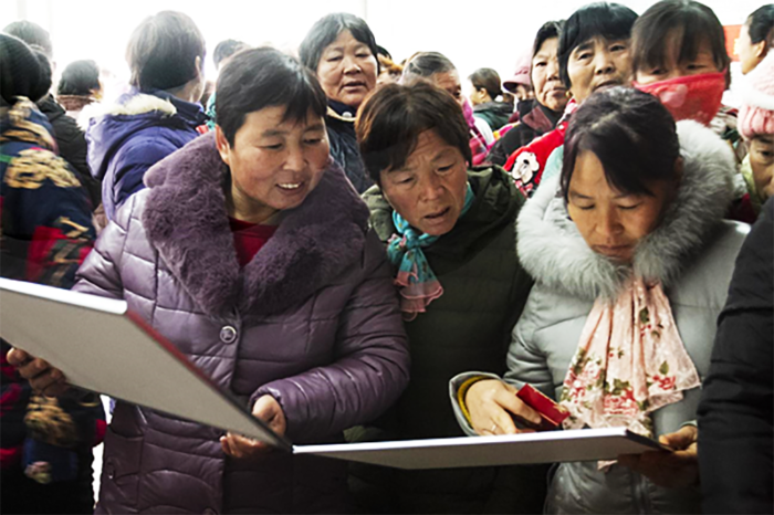 2018年河南省新鄉(xiāng)市延津縣的HPV篩查現(xiàn)場(chǎng),華大基因與當(dāng)?shù)卣?lián)合開展免費(fèi)宮頸癌篩查,當(dāng)?shù)乩习傩赵诤Y查現(xiàn)場(chǎng)等待篩查過程中觀看自取樣操作流程展板