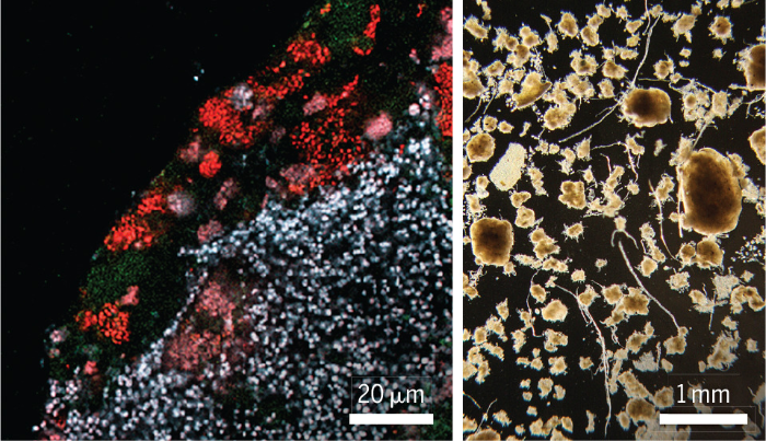 好氧顆粒污泥系統(tǒng)的切片顆粒(左)包括硝化菌(紅色)和反硝化聚磷酸鹽蓄積生物(PAO)(藍(lán)色)。顆粒來自連續(xù)流動(dòng)系統(tǒng)(右)。