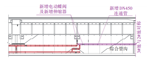 如某水質(zhì)凈化廠針對(duì)四組生物池放空系統(tǒng)中其中兩組無(wú)連通,結(jié)合現(xiàn)場(chǎng)實(shí)際情況,在現(xiàn)有放空系統(tǒng)的基礎(chǔ)上,增設(shè)一根DN450、長(zhǎng)度80m管道和配套電動(dòng)蝶閥和伸縮器,實(shí)現(xiàn)不連通的兩組生物池放空系統(tǒng)的連通,進(jìn)而實(shí)現(xiàn)四條線生物池放空系統(tǒng)的連通(見(jiàn)圖1)。