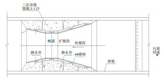 如某水質(zhì)凈化廠巴氏計(jì)量槽位于生物池外回流渠上,原巴氏計(jì)量槽由于標(biāo)高設(shè)計(jì)問(wèn)題,造成所有外回流泵停泵后,槽內(nèi)仍有近50cm積水。該巴氏計(jì)量槽(見(jiàn)圖2)開(kāi)一臺(tái)外回流泵的流量和關(guān)泵后的流量基本相同,明渠流量計(jì)無(wú)法正常測(cè)量。明渠流量計(jì)主要通過(guò)液位差來(lái)測(cè)量,由于在未開(kāi)泵的情況下,巴氏槽已有近50cm水深,因此往后每多開(kāi)一臺(tái)泵,液位上漲不明顯,明渠流量計(jì)測(cè)量出的數(shù)據(jù)也差別不大。造成計(jì)量不準(zhǔn)確的原因是外回流渠整體安裝位置過(guò)低,原巴氏槽安裝位置過(guò)低,導(dǎo)致未開(kāi)外回流泵時(shí)槽底部積水嚴(yán)重影響實(shí)際測(cè)量。為解決該問(wèn)題,通過(guò)將巴氏計(jì)量槽底部抬高60cm,使停泵后巴氏計(jì)量槽內(nèi)的積水可以流干,再對(duì)明渠流量計(jì)進(jìn)行調(diào)零等參數(shù)測(cè)試。改造后解決了渠道底部積水對(duì)計(jì)量的影響。
