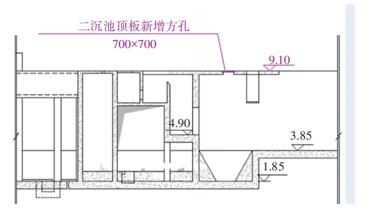 如針對(duì)半地下式污水處理廠矩形二沉池,無(wú)法設(shè)置放空系統(tǒng),需要人工放泵但無(wú)法放至池子最低處,結(jié)合現(xiàn)場(chǎng)實(shí)際情況,復(fù)核確認(rèn)不影響結(jié)構(gòu)的情況下在每組二沉池的集泥坑正上方(二沉池的最低處)開(kāi)孔,用來(lái)放置潛水泵,見(jiàn)圖3。
