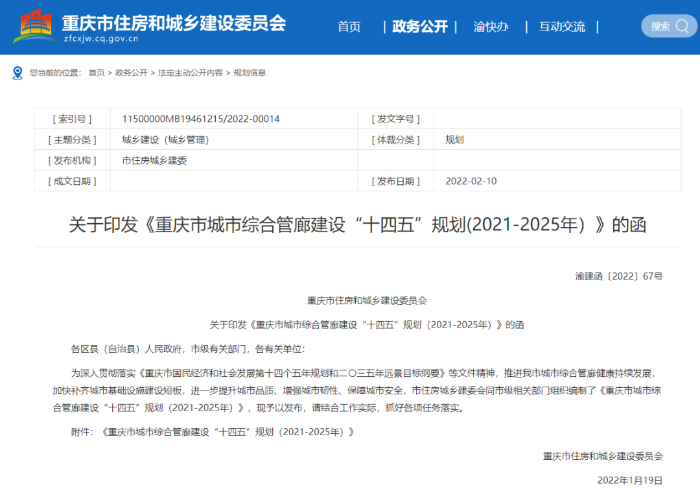 為貫徹住房和城鄉(xiāng)建設(shè)部推動(dòng)城市高質(zhì)量發(fā)展的要求、保障城市“生命線”的安全運(yùn)行,日前,《重慶市城市綜合管廊建設(shè)“十四五”規(guī)劃(2021~2025年)》(以下簡(jiǎn)稱《規(guī)劃》)發(fā)布?!兑?guī)劃》提到,至2025年年末,力爭(zhēng)城市新區(qū)新建道路綜合管廊配建率不小于30%。