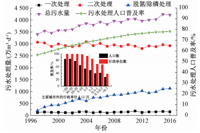 日本污水日平均處理量為4 208萬m3/d,日變化系數(shù)2.49±2.29;晴天日最大處理量5 711萬m3/d,晴天日平均3 623萬m3/d。1992年到2016年的25年間,日本污水處理總量增加了40.8%(見圖1);總?cè)丝谄占奥蕪?6%升高到78.3%,其中主要城市的污水處理總?cè)丝谄占奥室呀?jīng)達(dá)到了96.7%,30萬~100萬人城市的污水處理率從54.5%升高到84.4%,村鎮(zhèn)污水普及率從9.7%升高到53.4%,但人口不到5萬的行政單位普及率只有47.1%。由于多數(shù)污水處理后排?;蚪?jīng)過河流短時(shí)間即可流入海洋,日本污水處理多年前主要執(zhí)行二級(jí)處理,1996年二級(jí)處理量約3 000萬m3/d。近年日本對(duì)污水排放提出了更高要求,其深度處理量從1995年只有128萬m3/d逐年增加到2016年的1 133萬m3/d,約占當(dāng)年處理水量的26.9%,二級(jí)處理量以每年5萬m3/d遞減。