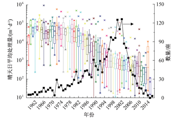 圖2 日本各年份建設(shè)的污水處理廠處理量及數(shù)量