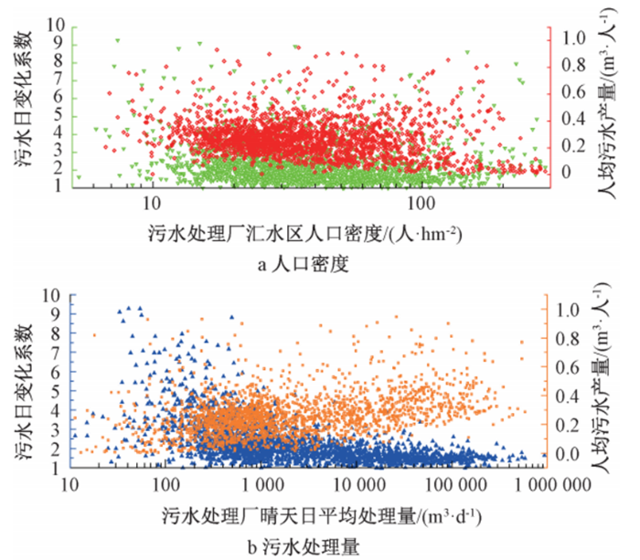 ①污水處理廠處理量越大則日變化系數(shù)越低,但人均污水產(chǎn)量變化范圍依然很大;