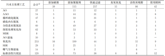 注:①數(shù)量根據(jù)形式差別判斷是否重復(fù)統(tǒng)計(jì),例如AO和AAO不做重復(fù)統(tǒng)計(jì),AO和階段進(jìn)水脫氮工藝做重復(fù)統(tǒng)計(jì);②部分氧化溝具有脫氮功能,但沒有做詳細(xì)劃分;③日本深度處理包括脫氮除磷、添加有機(jī)物、過濾、吸附等處理方法。