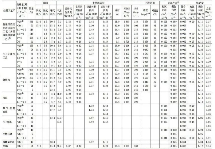 注:①數(shù)值為按照處理站數(shù)量計(jì)算,不統(tǒng)計(jì)有效數(shù)據(jù)個(gè)數(shù)小于5個(gè)的情況;②不同工藝有重復(fù)統(tǒng)計(jì);③普通活性污泥法及演變工藝包括延時(shí)曝氣、階段曝氣工藝及部分脫氮除磷工藝;④剩余污泥和混合污泥產(chǎn)量由于原始數(shù)據(jù)混亂而存在偏差。