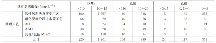 表2 不同處理規(guī)模(晴天日最大處理量)和工藝的污水處理廠水量①