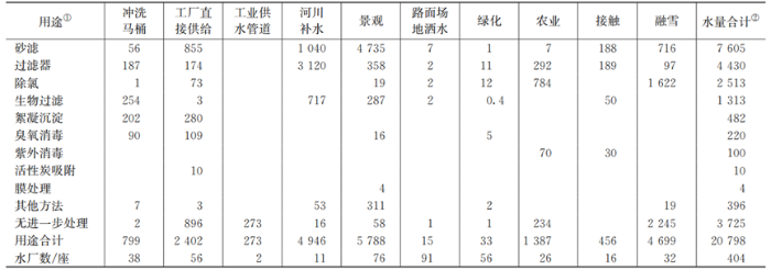 注:①可能有多種利用用途;②100~150座污水處理廠再利用水量小于0.1 萬m3/年或數(shù)據(jù)不詳,本表未計(jì)入。
