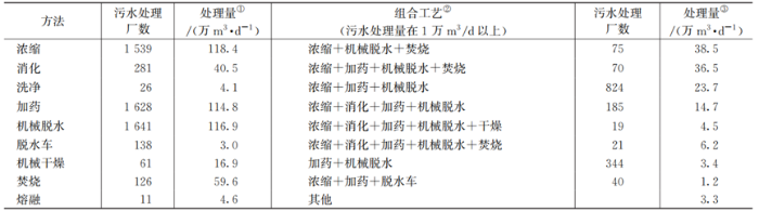 注:①處理量為污水處理過程排出的未經(jīng)過處理的污泥;②數(shù)值有重復(fù)統(tǒng)計(jì);③由于污泥處理過程中,會(huì)將初沉污泥和剩余污泥進(jìn)行混合,造成全文不同類型污泥量和處理過程有差異。