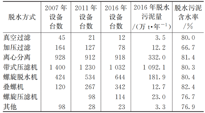 有25.6 萬m3/d不同性質(zhì)的污泥被脫水為4.55 萬t/d(見表12),含水率從約97.7%降低為80.6%。表13為主要脫水方式使用情況,只有加壓過濾方式的含水率在60%左右。其脫水方式的選擇需要考慮污泥性質(zhì)、脫水要求、操作方式等因素。2016年污泥脫水使用藥劑12 萬t,主要為聚合硫酸鐵3.49 萬t、氯化鐵1.74 萬t、石灰1.56 萬t、高分子聚合物4.51 萬t、聚氯化鋁0.39 萬t,其他藥劑0.33萬t,全部藥劑平均投加量為41.5 kg/t SS。