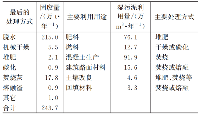 絕大部分污水處理廠污泥在處理過程中經(jīng)過了濃縮和脫水環(huán)節(jié),有大約45%污泥最后被焚燒(見表11)。