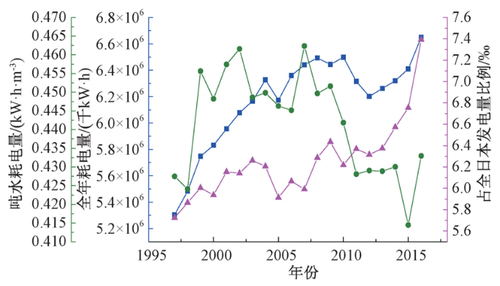 2016年日本下水道系統(tǒng)的電量使用中,污水管道輸送泵占9.9%,污水處理廠占90.1%,66.6 億kW·h/年,占全日本發(fā)電量的0.74%。平均噸水處理電耗為0.433 kW·h/m3,其中提升泵14.6%,污水處理53.0%,污泥處理22.3%,其他耗電為10.0%。近年來,由于日本污水處理總量和深度處理占比逐年增加(見圖1),污水處理廠耗電總量和占日本發(fā)電量比例都明顯提高(見圖4)。然而,噸水處理能耗反而呈現(xiàn)下降趨勢(shì),可能是進(jìn)行節(jié)能改造和運(yùn)行優(yōu)化的結(jié)果。日本的污水處理能耗高于中國(guó)0.288 kW·h/m3,可能原因是進(jìn)水水質(zhì)和污泥處理程度的差異。