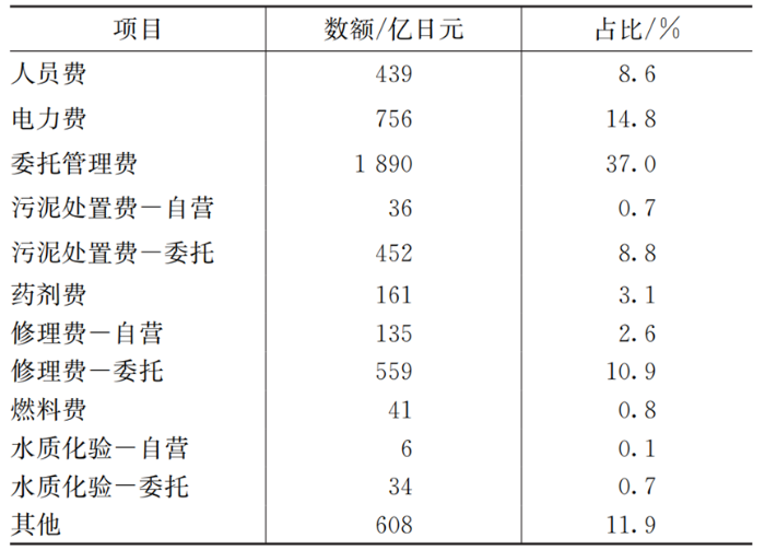 日本下水道系統(tǒng)包括污水處理廠、泵站和管道三個(gè)方面。2016年污水處理廠建設(shè)費(fèi)為6 164 億日元,“維持管理費(fèi)”為5 115 億日元,以委托費(fèi)為主。90%以上污水處理廠全部委托給第三方運(yùn)行,95%以上污泥等固體廢物委托處理,只有5%~10%由政府直接管理或部分管理。