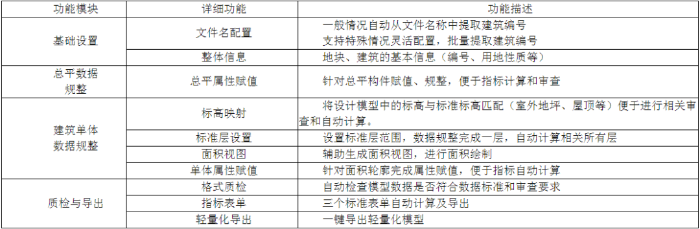第二,總體系統(tǒng)包含建筑工程輔助設(shè)計(jì)軟件工具。基于主流BIM設(shè)計(jì)軟件Revit研發(fā)BIM規(guī)劃報(bào)建輔助設(shè)計(jì)軟件,擁有4大功能模塊,實(shí)現(xiàn)12項(xiàng)功能(如表1所示)。