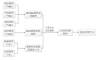 花博會(huì)項(xiàng)目模型主要包括整個(gè)園區(qū)多種格式的地形地貌模型、管道模型、場(chǎng)館模型、植被模型和水面模型,模型格式包括*.rvt、*.fbx、*.skp、*.3ds等,以及在SpeedTree中建立的三百余種植被模型,平臺(tái)分別對(duì)上述模型進(jìn)行數(shù)據(jù)處理后統(tǒng)一進(jìn)行渲染模擬。