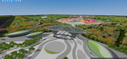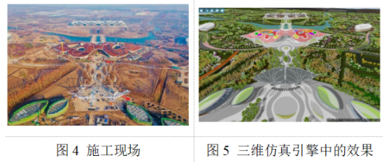 借助基于BIM+GIS的花博會(huì)三維可視化平臺(tái)可快速將設(shè)計(jì)好的場(chǎng)館模型進(jìn)行三維可視化呈現(xiàn),并且可以通過多角度進(jìn)行環(huán)境融合展示,從而提高方案可讀性和直觀性。在場(chǎng)館設(shè)計(jì)變更中,通過場(chǎng)館設(shè)計(jì)模型的直接調(diào)整就可通過展示平臺(tái)快速呈現(xiàn);在樹木分布方案變更中,通過三維可視化樹種庫來完成樹種1:1的數(shù)字化模擬,為園區(qū)樹木分區(qū)優(yōu)化提供了有力技術(shù)支持。