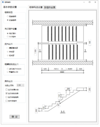 (2)預(yù)制樓梯拆分及深化設(shè)計(jì)。本項(xiàng)目選用標(biāo)準(zhǔn)樓層的梯段板作為樓梯的標(biāo)準(zhǔn)構(gòu)件,采用120mm厚度的預(yù)制雙跑樓梯,預(yù)制樓梯采用高端支承為固定鉸支座,低端支承為滑動(dòng)鉸支座的裝配方案。通過預(yù)制構(gòu)件深化設(shè)計(jì)系統(tǒng)中預(yù)制樓梯深化設(shè)計(jì)的樓梯放置功能,設(shè)置樓梯參數(shù)后(如圖9所示),把預(yù)制樓梯放置在模型中。