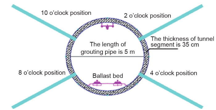 (5)利用每環(huán)管片的4個(gè)注漿孔,對(duì)周圍土體進(jìn)行加固注漿,其中道床位置的注漿孔不注漿,注漿完成后注漿管留在土中。每環(huán)管片進(jìn)行一個(gè)斷面注漿。在一個(gè)注漿斷面上,同時(shí)對(duì)管片對(duì)稱面兩處注漿孔進(jìn)行對(duì)稱注漿,注漿壓力不超過0.5MPa。