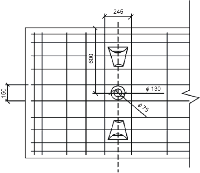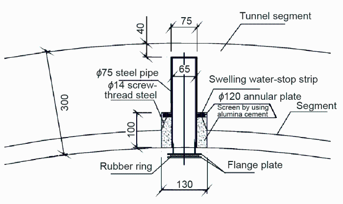(1)管片開孔。管片開孔分兩步進(jìn)行,先在隧道正上部用取芯機(jī)打設(shè)一個(gè)外徑為Φ130mm、深度為100mm的孔。此位置位于兩個(gè)手孔中間;隨后在同一圓心處打設(shè)外徑Φ75mm、深度為160mm的孔(見圖8)。