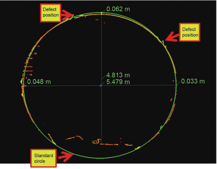 在本工程中采用高精準(zhǔn)自動(dòng)化監(jiān)測系統(tǒng)有效地記錄了隧道的真實(shí)狀態(tài)與缺陷信息,如標(biāo)注滲水區(qū)域或破損區(qū)域的面積等;通過對(duì)比不同時(shí)期隧道掃描結(jié)果,得出隧道結(jié)構(gòu)在此期間的變形情況(詳見圖14),同時(shí)得出了隧道結(jié)構(gòu)與設(shè)計(jì)圖紙的偏差,有效地指導(dǎo)了施工,真正實(shí)現(xiàn)了信息化施工。