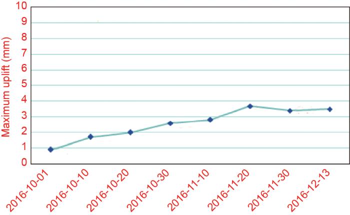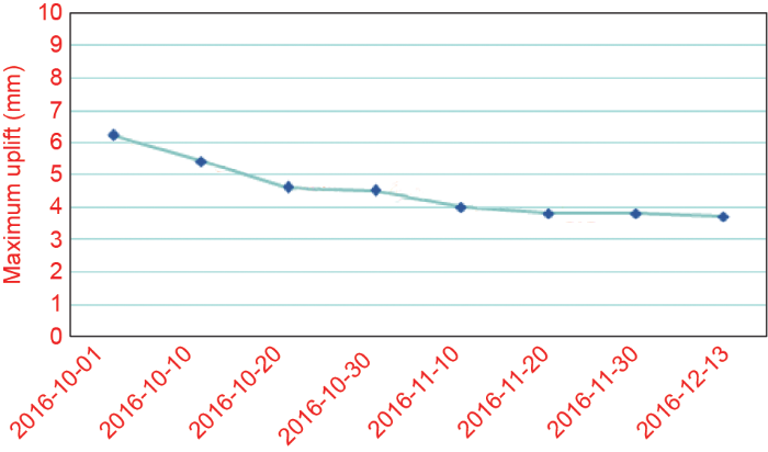 運(yùn)營隧道左線的隆起與沉降相對(duì)變化量較大,最大隆起與沉降的時(shí)程曲線見圖18和圖19。