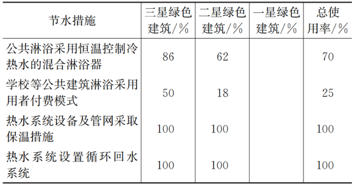 注:“公共淋浴采用恒溫控制冷熱水的混合淋浴器”“熱水系統(tǒng)設(shè)備及管網(wǎng)采取保溫措施”“熱水系統(tǒng)設(shè)置循環(huán)回水系統(tǒng)”項統(tǒng)計時只計入設(shè)置集中熱水系統(tǒng)的項目。