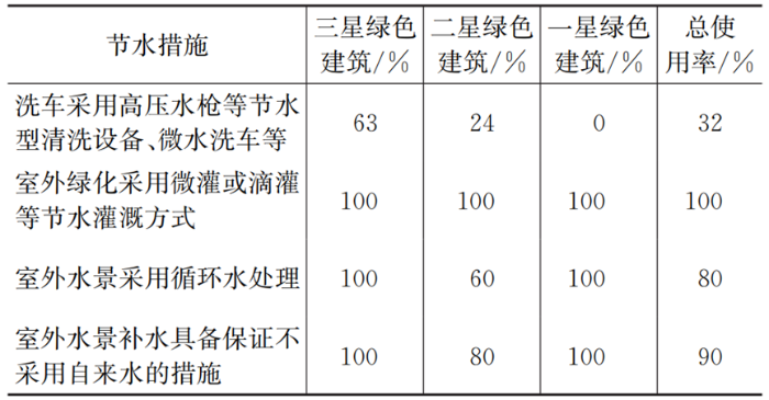 節(jié)水型洗車由于使用場景有一定局限性(如商場地下停車庫需設(shè)有洗車車位等),所以本次調(diào)研數(shù)據(jù)僅為初步參考。室外綠化采用微灌或滴灌等節(jié)水灌溉方式可以減少灌溉水量的蒸發(fā),并且作為綠色建筑星級評定的得分項,已經(jīng)成為一種常態(tài)化的節(jié)水方式?!笆彝馑安捎醚h(huán)水處理”在三星級綠色建筑和二星級綠色建筑中的采納率(分別為100%和60%)差異較大,需引起重視;循環(huán)水處理措施作為較好的水質(zhì)保障措施,除特別小型的水景外,均應(yīng)考慮采納。
