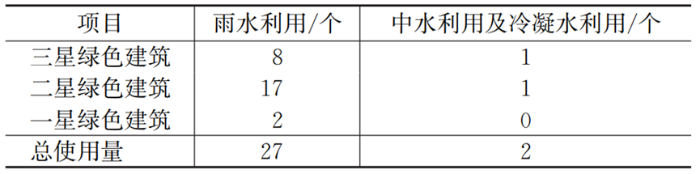 (2)非傳統(tǒng)水資源利用以雨水利用為主要利用形式。雨水利用在工程項目中覆蓋率較高,但考慮到其使用場景,有相當(dāng)一部分公共建筑非傳統(tǒng)水資源利用率較低,設(shè)計不合理,存在節(jié)水措施為了滿足綠色建筑星級評定而設(shè)置的現(xiàn)象。