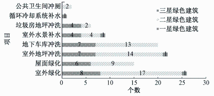 在使用非傳統(tǒng)水資源的27個項目中,其非傳統(tǒng)水資源利用場景如圖2所示。考慮到部分項目或許未設(shè)計室外水景、屋面綠化等設(shè)施,調(diào)研數(shù)據(jù)僅作初步概況統(tǒng)計。由圖2可知,絕大部分利用非傳統(tǒng)水資源的項目,會將回用水用于對水質(zhì)要求較低、回用系統(tǒng)也更簡單的室外綠化、室外道路廣場沖洗及地下車庫沖洗。而同樣是地坪沖洗,“垃圾房地坪沖洗”比“地下車庫沖洗”采納量(分別為6個和20個)低了許多,其原因或許是有的項目在垃圾房也設(shè)有洗手盆,產(chǎn)生了兩者總用水量并不大但需分設(shè)給水系統(tǒng)的原因,有些工程項目為了方便和減少成本只采用自來水單一給水系統(tǒng)。而大型公共建筑“循環(huán)冷卻系統(tǒng)補(bǔ)水”水量需求較大、“公共衛(wèi)生間沖廁”則需要水量穩(wěn)定性較高,對項目獲取原水的水量、穩(wěn)定性及蓄水設(shè)施、處理設(shè)備等有一定要求,將會增加建設(shè)和運(yùn)營管理成本,所以在調(diào)研的項目中采納率較低。