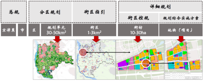 北京面向特大城市精細(xì)治理,堅(jiān)持首善標(biāo)準(zhǔn),踐行宜居城市、活力城市、務(wù)實(shí)城市的規(guī)劃理念,加強(qiáng)不同顆粒度、不同場景、不同區(qū)域、不同專項(xiàng)和不同時(shí)序等多維度技術(shù)研究和差異引導(dǎo),探索性地制定管用、好用、實(shí)用的編制技術(shù)標(biāo)準(zhǔn),并構(gòu)建了上下互動、有序傳導(dǎo)、批備一體、剛?cè)嵯酀?jì)的詳細(xì)規(guī)劃層級體系。在分區(qū)規(guī)劃審批下形成街區(qū)指引傳導(dǎo)備案層,在街區(qū)控規(guī)審批下形成地塊方案傳導(dǎo)備案層,并指導(dǎo)規(guī)劃綜合實(shí)施方案編制工作;建立了從總規(guī)到分區(qū)規(guī)劃再到詳細(xì)規(guī)劃的邏輯自洽、以及由街區(qū)指引到街區(qū)控規(guī)再到規(guī)劃綜合實(shí)施方案的層層遞進(jìn)關(guān)系。