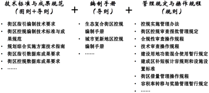 詳細(xì)規(guī)劃成果體系也發(fā)生了變化?!耙粡垐D”數(shù)據(jù)庫、編制工具箱、管理政策包的組合模式已成為常態(tài):“一張圖”數(shù)據(jù)庫構(gòu)建了互為因果、循環(huán)往復(fù)的現(xiàn)狀、規(guī)則、審批動態(tài)維護(hù)體系;工具箱包括了標(biāo)準(zhǔn)、規(guī)范、指南等;政策包包含了管理辦法、規(guī)程、細(xì)則等。