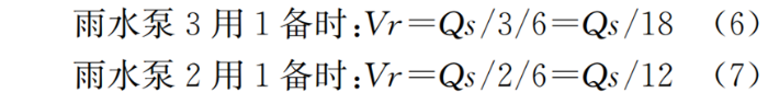 要明確雨水泵站集水池有效容積,需要明確單臺(tái)雨水泵排水量,《室外排水設(shè)計(jì)規(guī)范》建議雨水泵站水泵數(shù)量范圍為2~8臺(tái),《地鐵設(shè)計(jì)規(guī)范》要求隧道洞口雨水泵站雨水泵設(shè)置3臺(tái),水泵數(shù)量較少時(shí)安全系數(shù)較低,偏多時(shí)排水總量折減較大,參考國內(nèi)類似工程設(shè)計(jì)經(jīng)驗(yàn),汕頭蘇埃通道雨水量較大時(shí)設(shè)置4臺(tái)雨水泵(3用1備),雨水量較小時(shí)設(shè)置3臺(tái)雨水泵(2用1備),單臺(tái)水泵排水能力不小于最大小時(shí)設(shè)計(jì)流量的1/3或1/2,由此可建立雨水泵站集水池有效容積與設(shè)計(jì)流量的關(guān)系式見式(6)和式(7):