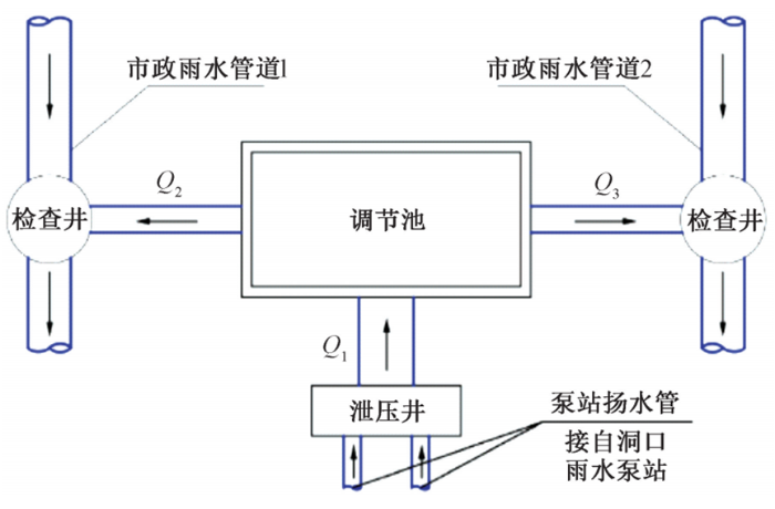 (2)雨水泵站周邊有市政雨水管道。隧道雨水泵站周邊敷設(shè)有市政雨水管道時(shí),首先應(yīng)判斷雨水泵站的集中出水是否可以直排市政雨水管道,需要知道市政雨水管道可接納水量,可接納水量數(shù)值到排水管道產(chǎn)權(quán)部門查閱,當(dāng)沒有具體資料時(shí),可進(jìn)行粗略計(jì)算,計(jì)算方法如下:根據(jù)《室外排水設(shè)計(jì)規(guī)范》市政雨水管道最小設(shè)計(jì)流速為0.75 m/s,考慮到淤積等因素,設(shè)計(jì)時(shí)最小流速通常取1 m/s,市政雨水管道的實(shí)際流速按式(8)進(jìn)行計(jì)算,計(jì)算得到的數(shù)值為最大設(shè)計(jì)流速V,可接納水量采用式(9)進(jìn)行計(jì)算,當(dāng)Qg大于雨水泵站設(shè)計(jì)流量時(shí),直接排入市政雨水管道,當(dāng)Qg小于雨水泵站設(shè)計(jì)流時(shí),需要采取措施后才能排入市政雨水管道,建議在泄壓井后設(shè)置調(diào)節(jié)池,調(diào)節(jié)池計(jì)算方法參考《排水工程》(第四版),平面布置圖見圖5,雨水泵站設(shè)計(jì)雨水量為Q1,調(diào)節(jié)水池的出水量為Q2+Q3,當(dāng)Q1≤(Q2+Q3)時(shí),雨水全部排入市政雨水管道,調(diào)節(jié)池水位逐漸下降,直至排空。當(dāng)Q1>(Q2+Q3)時(shí),調(diào)節(jié)池容納多余雨水量,調(diào)節(jié)池水位升高,隨著降雨減弱,雨水泵站出水流量減少。