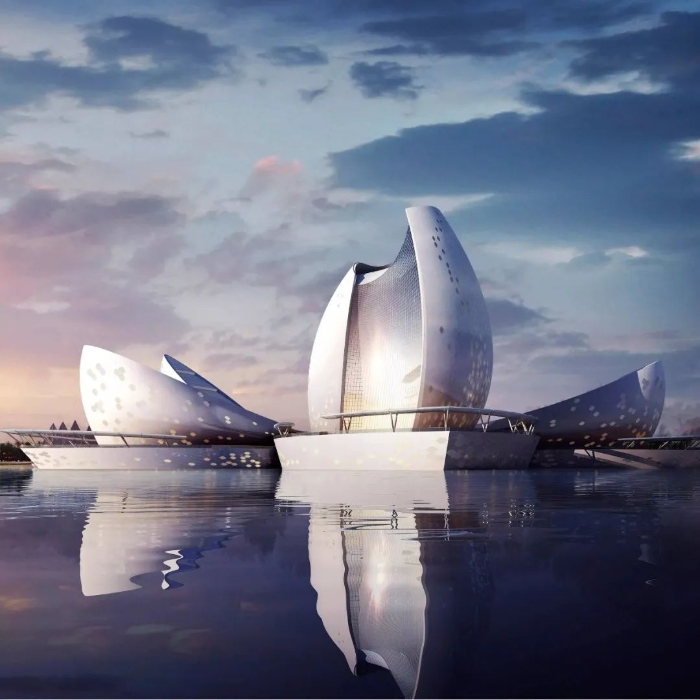 該項(xiàng)目是一個(gè)公共建筑群,包括海洋博物館、海洋生物多樣性研究中心、海上會(huì)議中心和岸堤公園,以期宣傳海洋文明和保護(hù)海洋生物。采用“海上花”的設(shè)計(jì)理念,使堤岸、沙灘、島礁、大海、公園、廣場、平臺(tái)、建筑多種元素渾然一體。主體建筑以海洋博物館主館高聳的“海螺”為重心,博物館副館、研究中心和海上會(huì)議廳3個(gè)建筑取相似的“貝殼”形態(tài),圍繞在主館周圍。這些海螺貝殼時(shí)而聚合,時(shí)而開放,猶如水上蓮花含苞待放。
