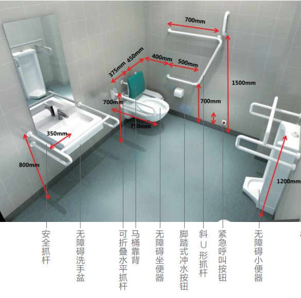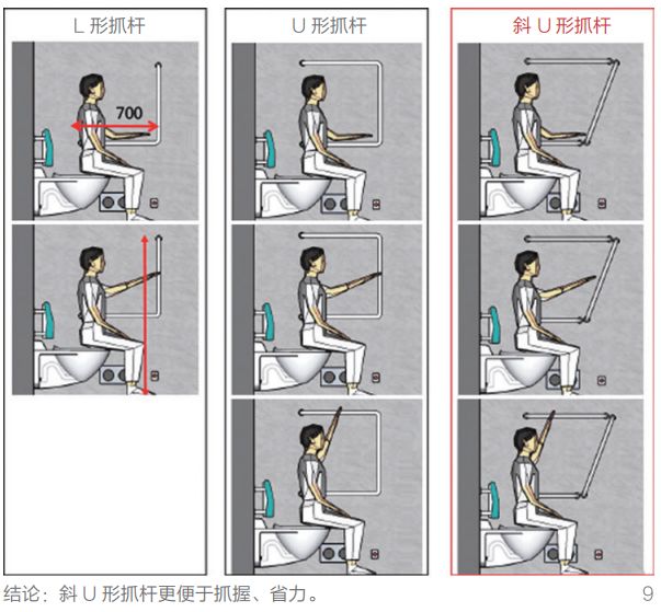 衛(wèi)生器具設(shè)置安全抓桿。對于扶手的抓桿形式,設(shè)計研究人體坐姿情況下的手臂前伸距離,以及從輪椅到坐便器的動作過程所需要抓握的位置及高度。將傳統(tǒng)的L形抓桿進行了優(yōu)化設(shè)計,考慮起身后的抓握,優(yōu)化為U形抓桿,再轉(zhuǎn)變?yōu)楦×Φ男盪形抓桿(圖9)。